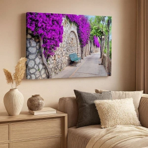 Lærredet er spændt op over rammen. Siderne og kanterne trykkes for at danne en fortsættelse af billedet. Maleriet er klar til at blive hængt op på væggen. Hvert produkt har en bøjle, der er fastgjort til rammen, og et samlesæt (skrue + dyvel).