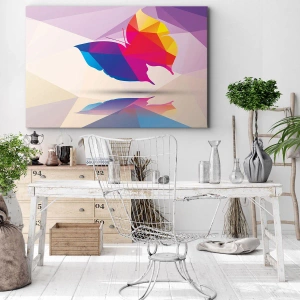 "Sommerfugle-regnbue" er et lærredsmaleri på 70x50 cm, der begejstrer med sit geometriske mønster og intense farver. Det forestiller en sommerfugl, hvis silhuet sammensat af abstrakte former skaber en dynamisk og moderne komposition. Levende farver som pink, blå og gul understreger naturens energi og skønhed.