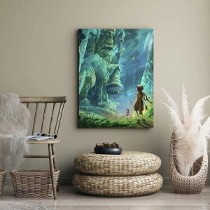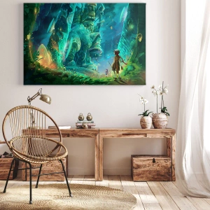 - Dette maleri forestiller en magisk skov, hvor en opdagelsesrejsende står foran en kæmpe, fortryllet figur. Dets livlige farver, mystiske atmosfære og eventyrlige omgivelser gør det ideelt til at dekorere interiører, der spænder af kreativitet.