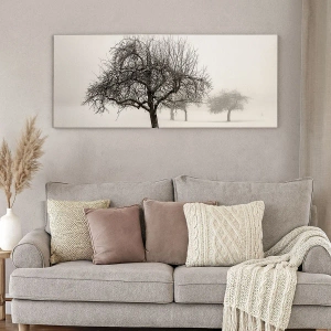 - Et diskret landskab, der forestiller træer i en snedækket mark omgivet af tåge. Dette minimalistiske maleri bringer fred og harmoni til ethvert interiør.
