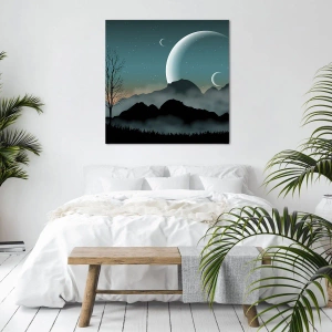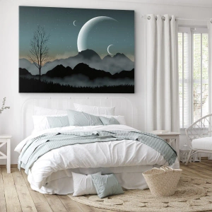 Lærredskunst "Tågede bjerge med måne" er en unik interiørtilføjelse, der tiltrækker opmærksomhed med sin ekstraordinære atmosfære. Den skildrer tågede bjergtoppe i skumringen, hvor et ensomt træ triller op mod og fremhæver naturens skønhed i en subtil og minimalistisk form. En karakteristisk måne, ledsaget af stjerner, svæver over landskabet og skaber en atmosfære af fred og ro.
