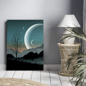 Lærredstryk - Billede på lærred - Tågede bjerge med månen og et ensomt træ - 70x50cm - Karneval i den stjerneklare nat - Moderne vægdekoration til stue og soveværelse ARTTOR