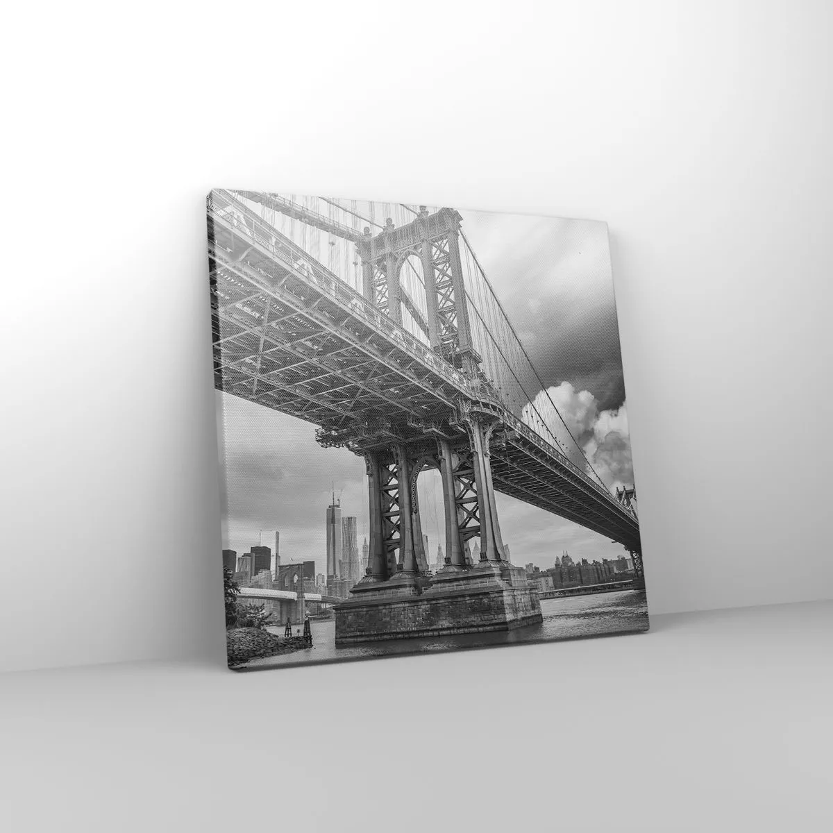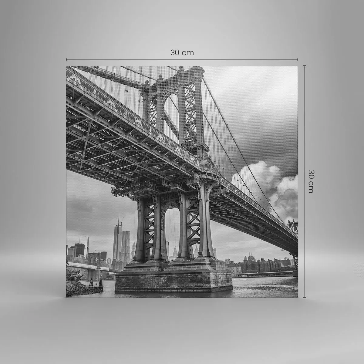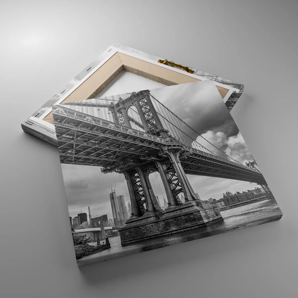 Lærredet er spændt op over rammen. Siderne og kanterne trykkes for at danne en fortsættelse af billedet. Maleriet er klar til at blive hængt op på væggen. Hvert produkt har en bøjle, der er fastgjort til rammen, og et samlesæt (skrue + dyvel).