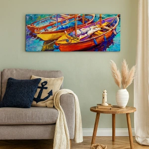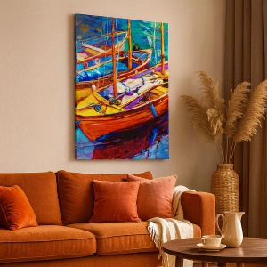 Lærredet er spændt op over rammen. Siderne og kanterne trykkes for at danne en fortsættelse af billedet. Maleriet er klar til at blive hængt op på væggen. Hvert produkt har en bøjle, der er fastgjort til rammen, og et samlesæt (skrue + dyvel).