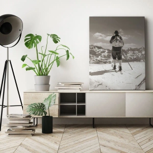 - Dette maleri forestiller en skiløber på en bjergtop, fanget i sort-hvid, hvilket skaber en nostalgisk atmosfære. Det er den perfekte dekoration for bjergelskere og entusiaster af vintage-stil.