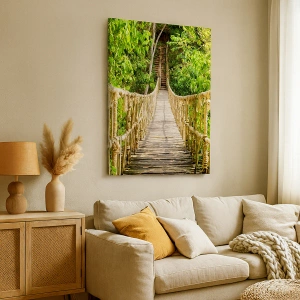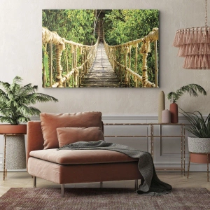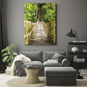 En tropisk skov, fuld af intens grøn vegetation, skaber en baggrund for broen, som synes at være en invitation til at opdage det ukendte. Frodig natur, broens reb og træplanker tilføjer autenticitet og en eventyrlig karakter til scenen. Dette er et maleri, der tiltrækker opmærksomhed og inspirerer til rejser.
