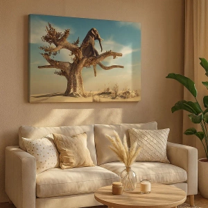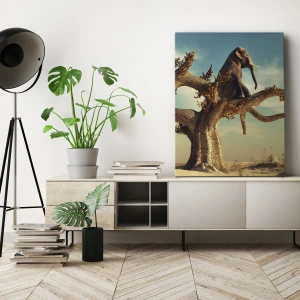 - Dette lærredstryk forestiller en elefant, der sidder i et træ i et surrealistisk landskab. Perfekt til interiører, der værdsætter originalitet og kreativitet.
