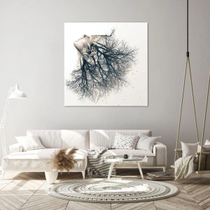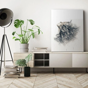 - Et kunstnerisk maleri, der forestiller silhuetten af en kvinde flettet sammen med trægrene. En minimalistisk og symbolsk komposition, der bringer inspiration og harmoni til ethvert interiør.