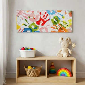 Lærredet er spændt op over rammen. Siderne og kanterne trykkes for at danne en fortsættelse af billedet. Maleriet er klar til at blive hængt op på væggen. Hvert produkt har en bøjle, der er fastgjort til rammen, og et samlesæt (skrue + dyvel).