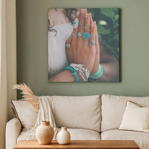Lærredet er spændt op over rammen. Siderne og kanterne trykkes for at danne en fortsættelse af billedet. Maleriet er klar til at blive hængt op på væggen. Hvert produkt har en bøjle, der er fastgjort til rammen, og et samlesæt (skrue + dyvel).