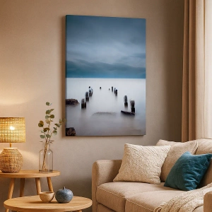 Dette lærredsmaleri på 70x50 cm med titlen "Tænksom sø" skildrer et roligt havlandskab med udsigt over en gammel træmole. Diskrete blå nuancer og en minimalistisk form i maleriet bringer en atmosfære af harmoni, fred og inspiration til interiøret.