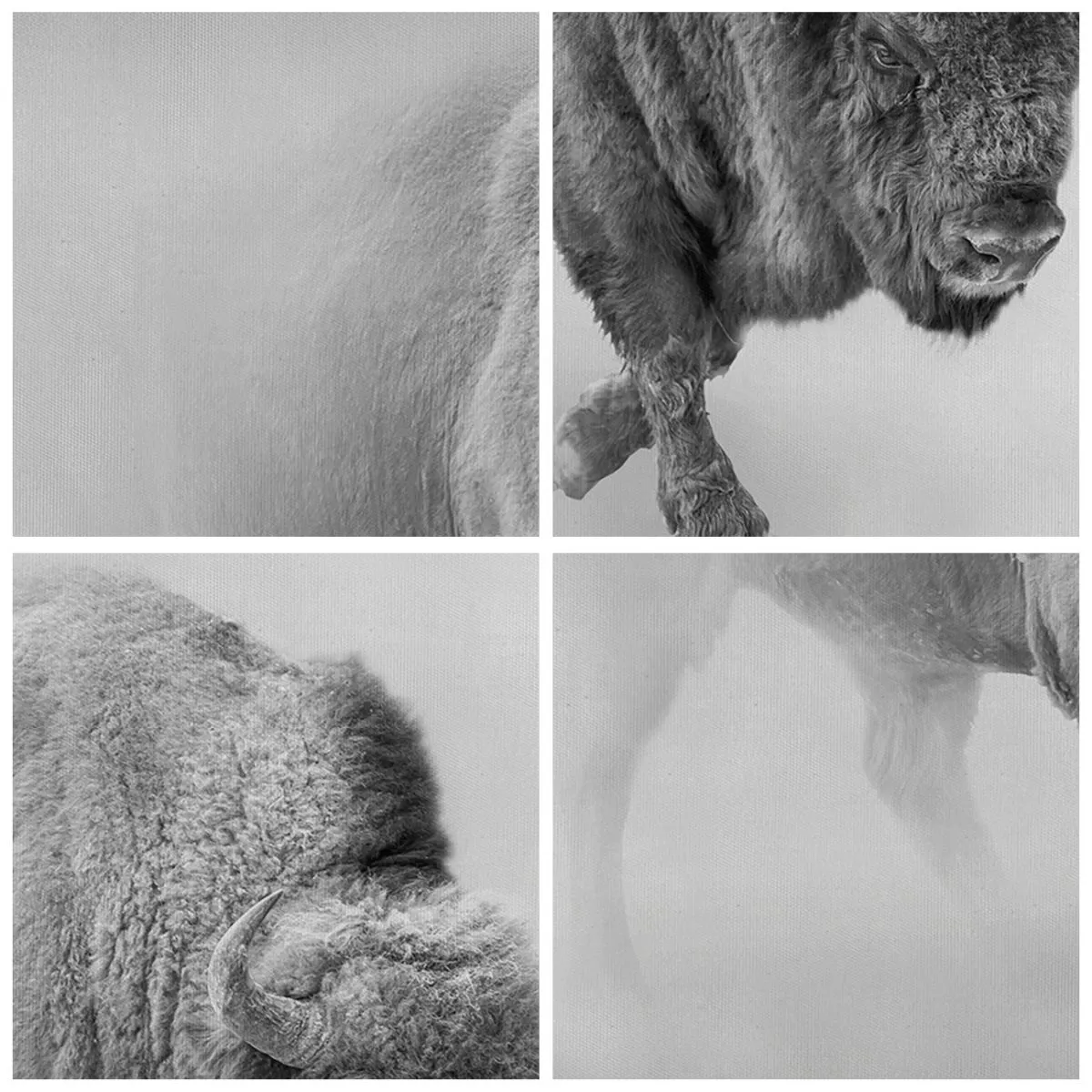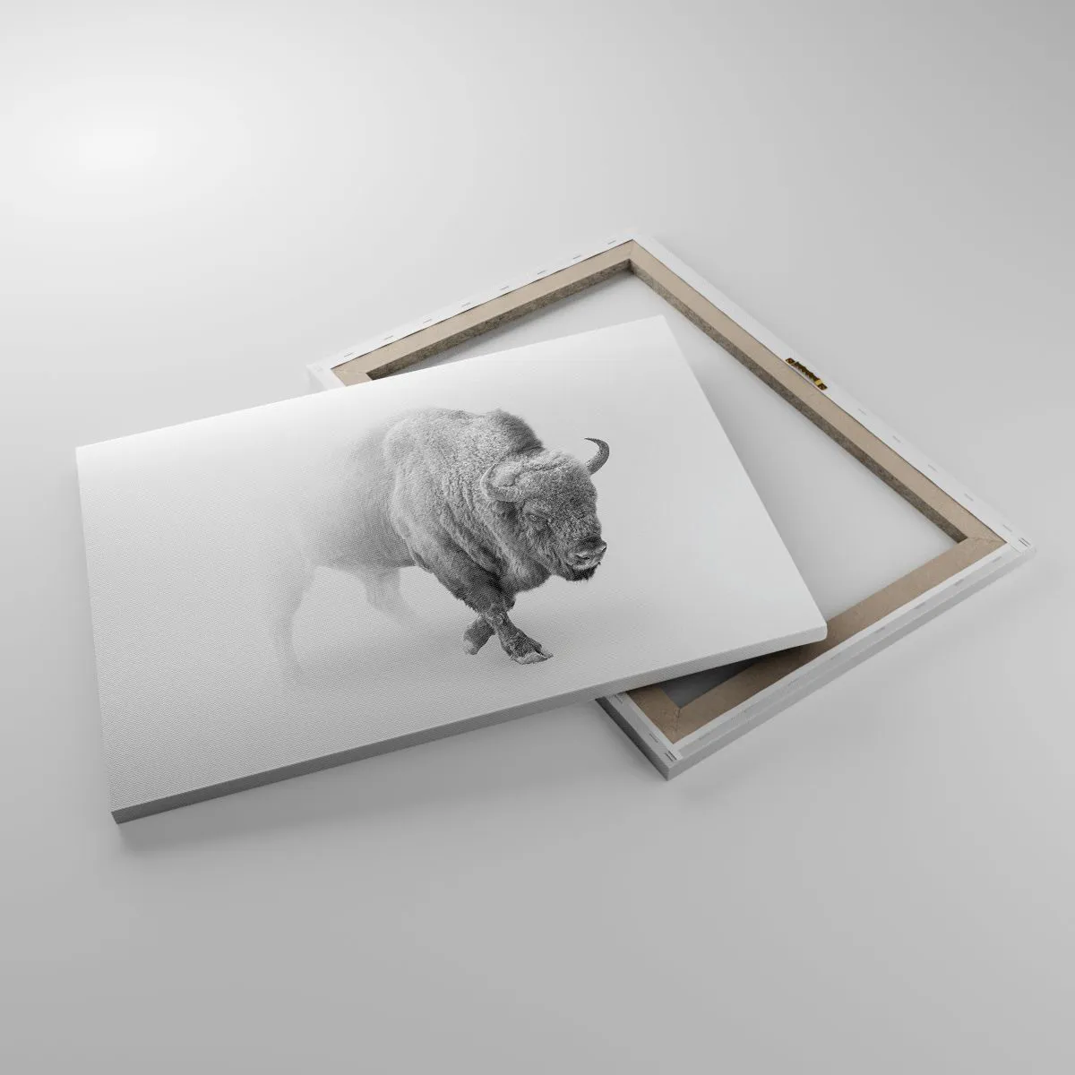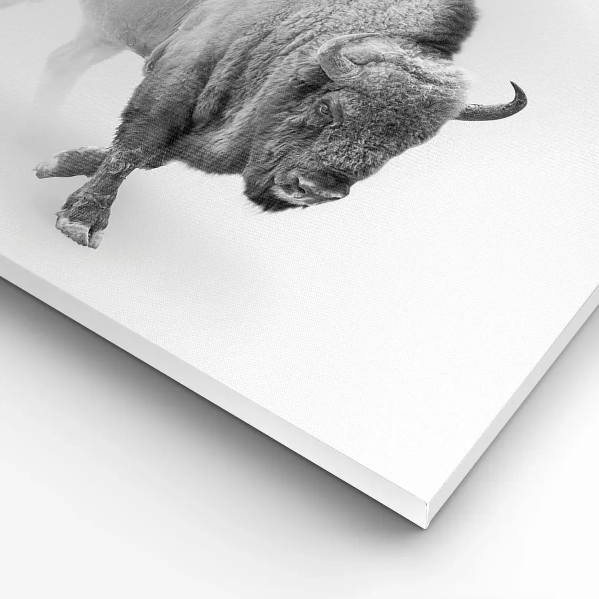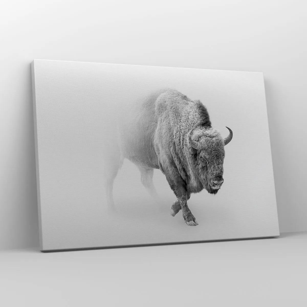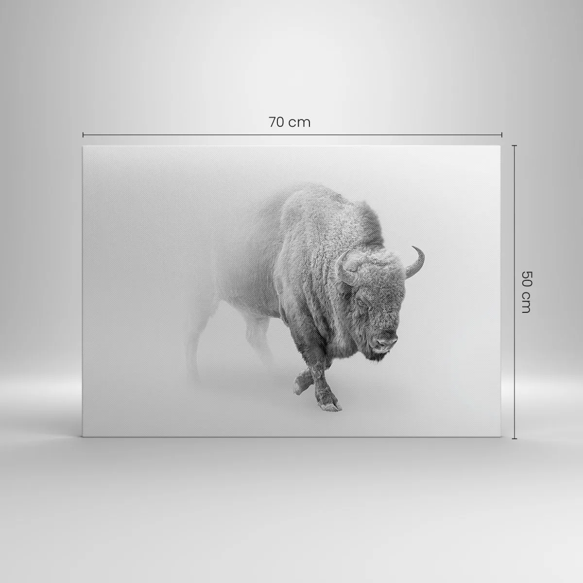 - Dette monokrome maleri forestiller en hvid bison i et barskt, minimalistisk miljø. En perfekt tilføjelse til elegante, moderne interiører.