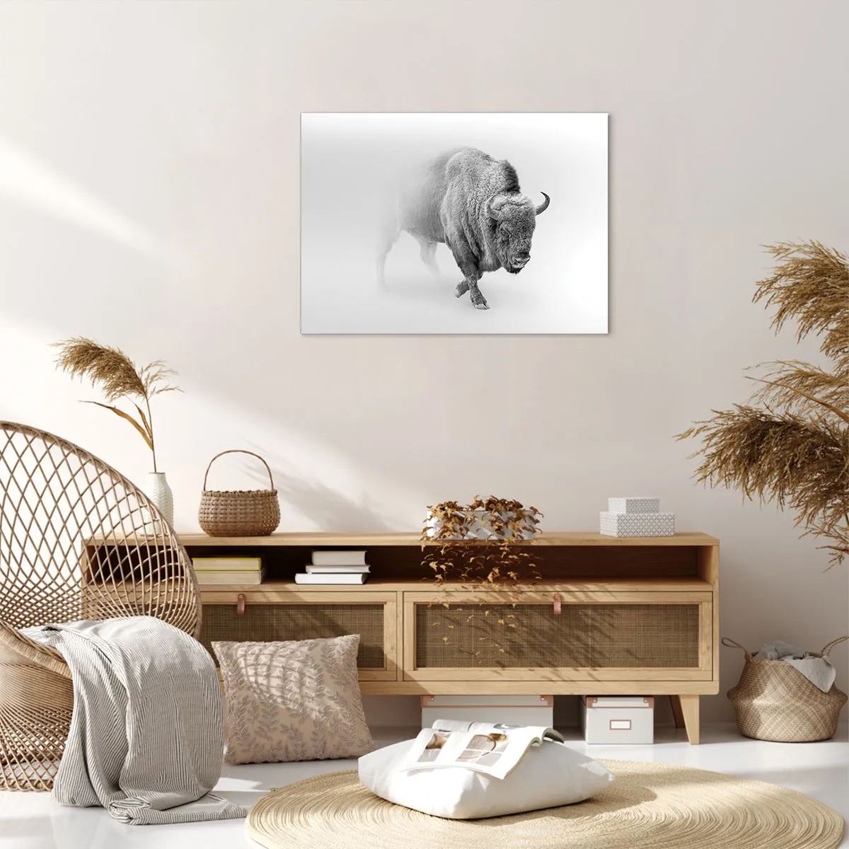 Motivet med den hvide bison symboliserer frihed og naturens kraft, hvilket gør det til et ideelt valg for naturelskere og minimalistisk stil. Dens universelle natur gør det nemt at matche forskellige farveskemaer og indretningsdesigns.