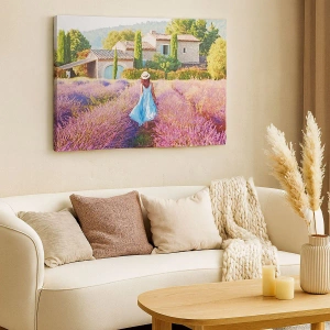 Lærredstryk - Billede på lærred - En kvinde i en blå kjole går gennem en lavendelmark med udsigt til et hus. - 70x50cm - Lavendel pige - Moderne vægdekoration til stue og soveværelse ARTTOR