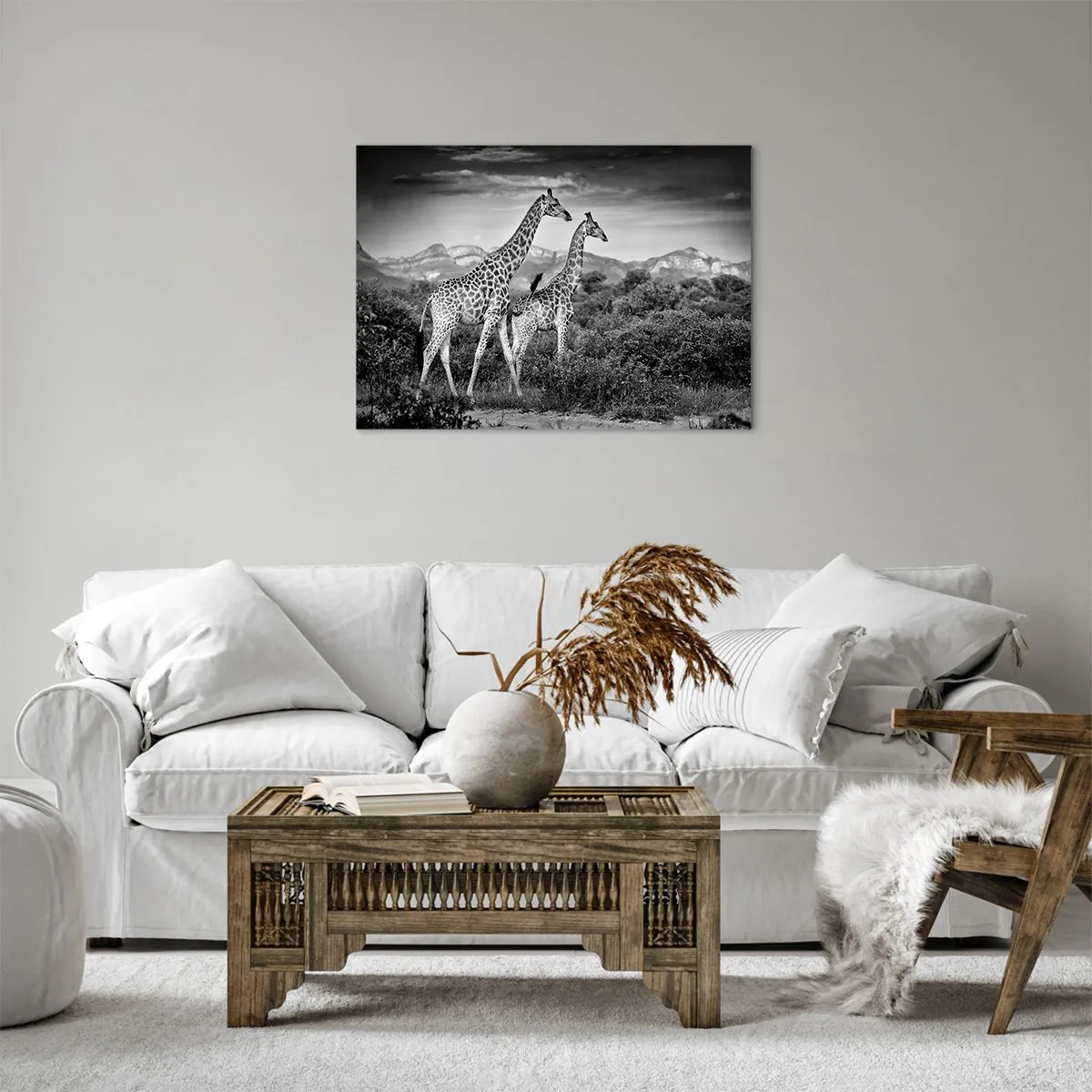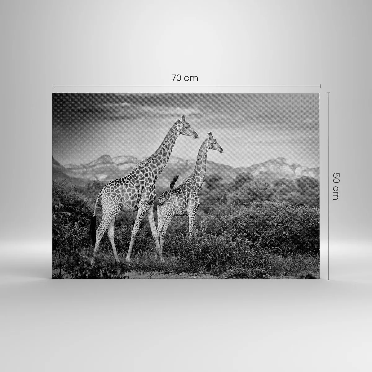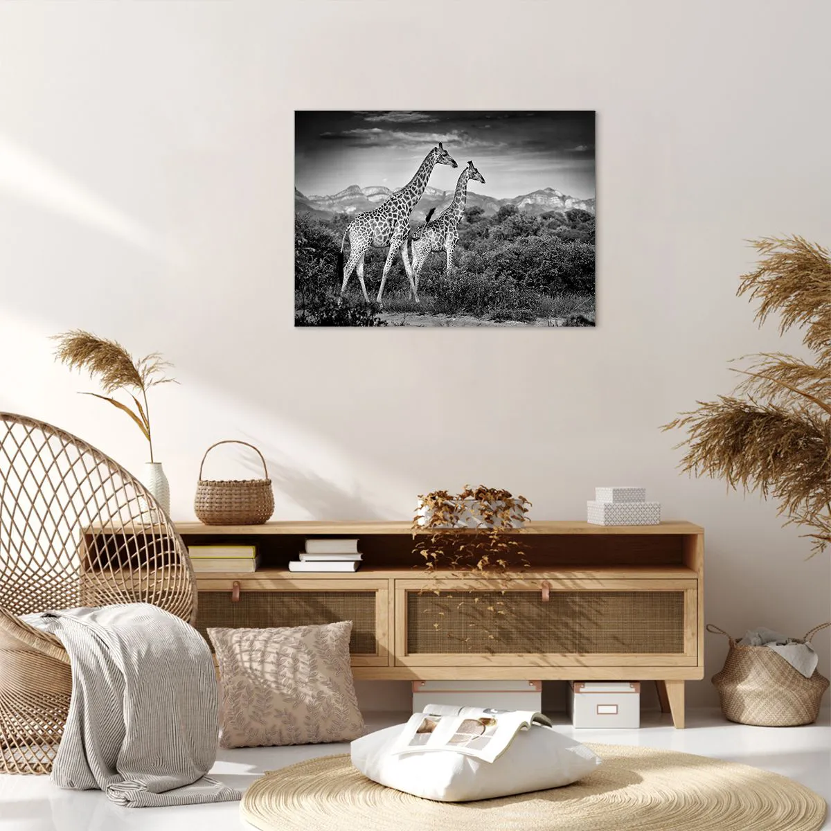 - Dette stilfulde sort-hvide maleri forestiller to giraffer på den afrikanske savanne. Denne minimalistiske komposition med dyreliv er perfekt til moderne interiører.