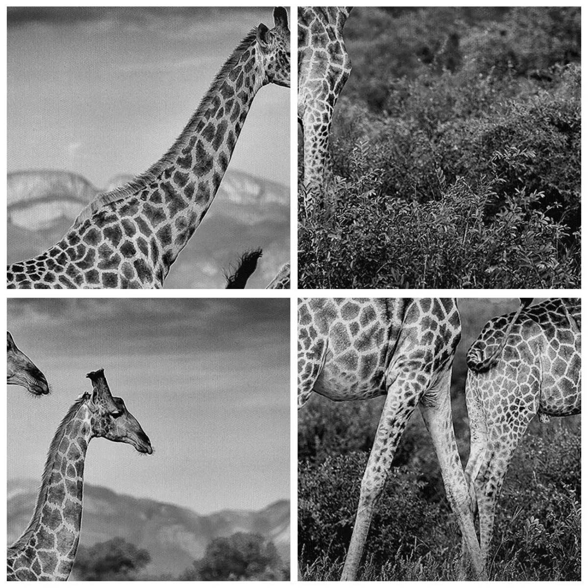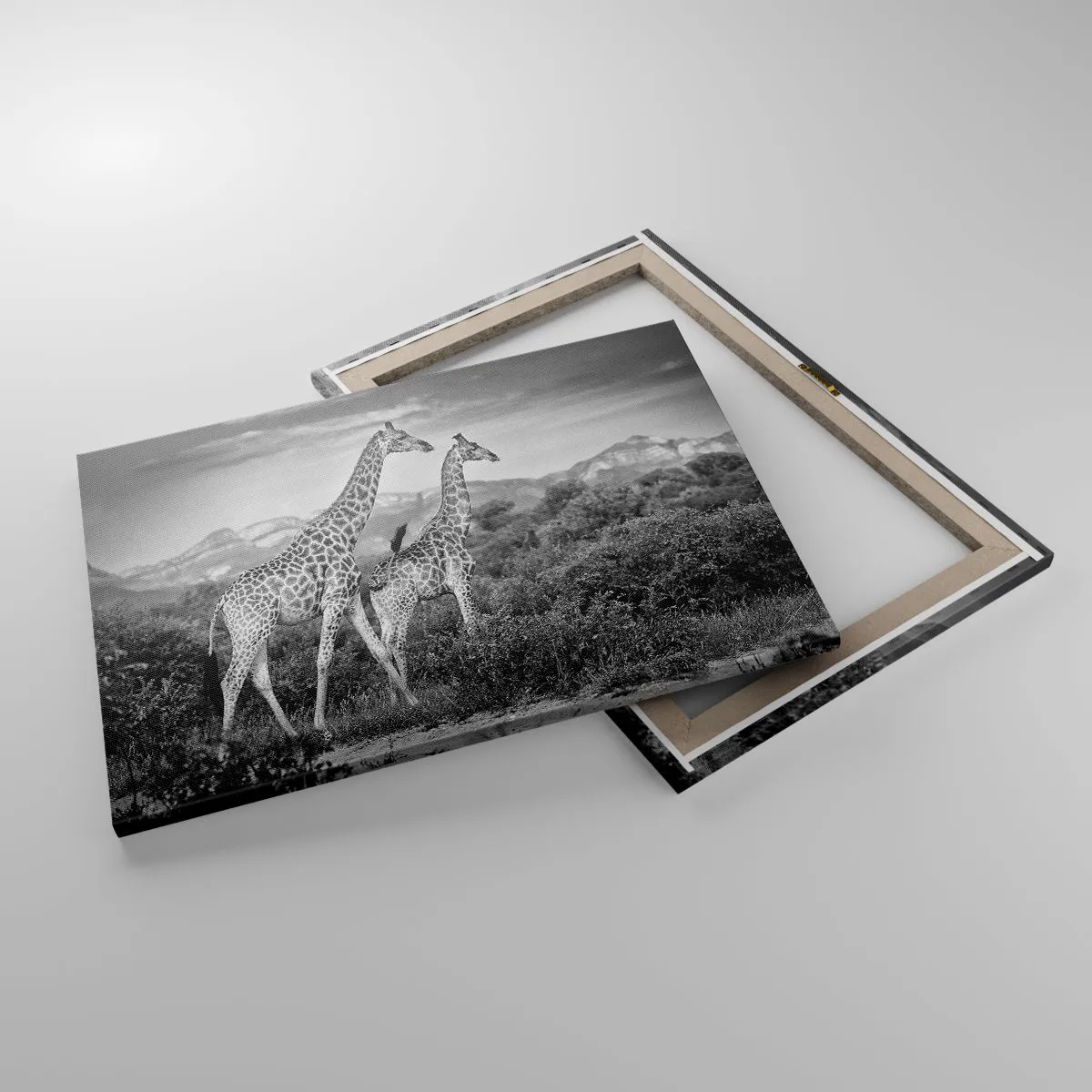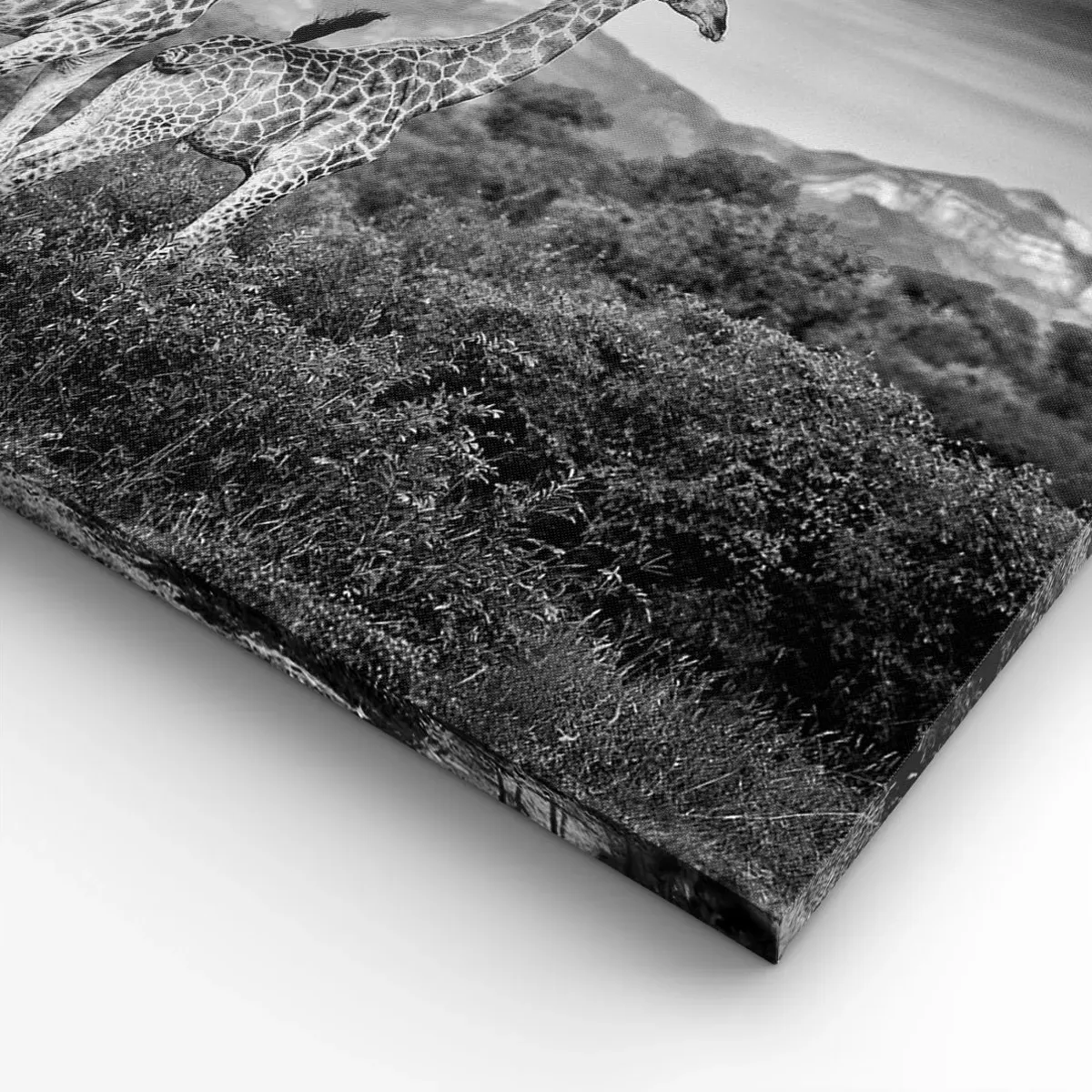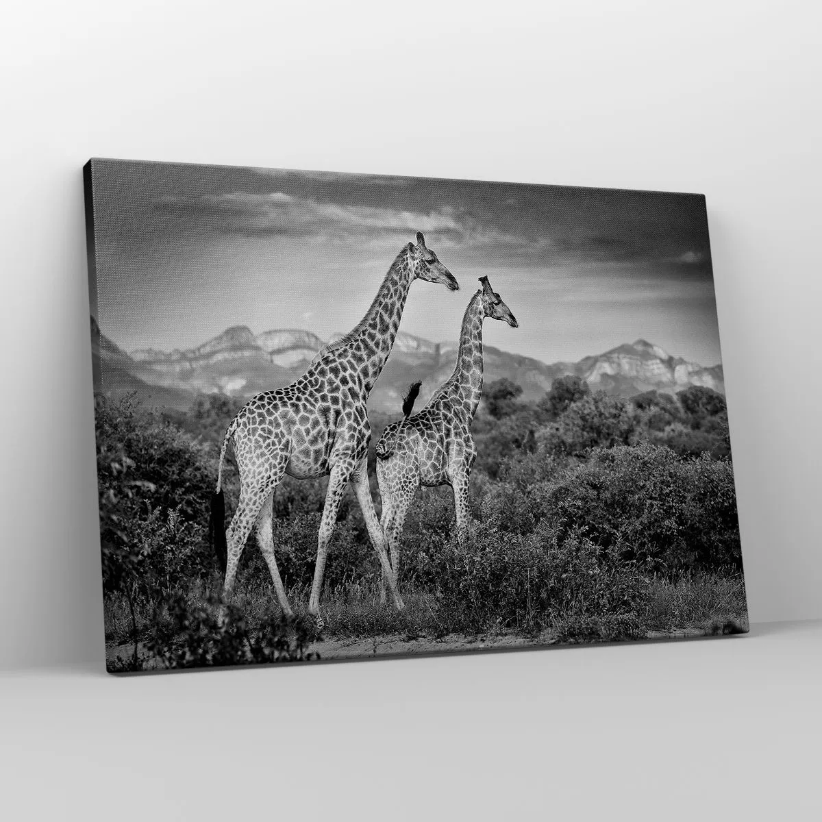 - Dette stilfulde sort-hvide maleri forestiller to giraffer på den afrikanske savanne. Denne minimalistiske komposition med dyreliv er perfekt til moderne interiører.