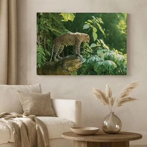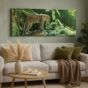 - Dette lærredstryk på 70x50 cm forestiller en leopard stående på en klippe midt i tropisk vegetation. Det er en perfekt dekoration for elskere af eksotisk natur og vild skønhed og tilføjer et karakteristisk præg til ethvert interiør.