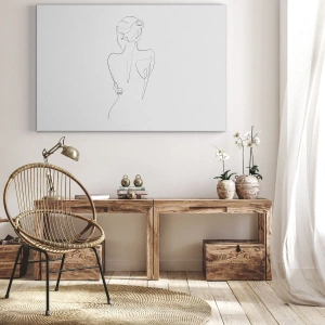 - Dette lærredstryk på 70x50 cm skildrer en delikat kontureret kvindelig silhuet mod en lys baggrund. Dets minimalistiske stil og subtilitet gør det til et ideelt supplement til moderne interiører.