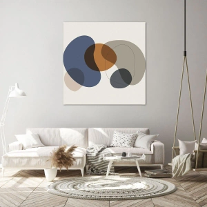 - Dette maleri, med abstrakte former i nuancer af blå og brun, er minimalistisk i stilen. Perfekt til moderne interiører. Lærredstrykket måler 70x50 cm.