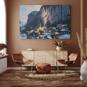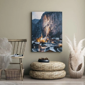 - Et vinterlandskab af en landsby omgivet af majestætiske bjerge, oplyst af varmt lys. En perfekt dekoration for elskere af vinterlandskaber.