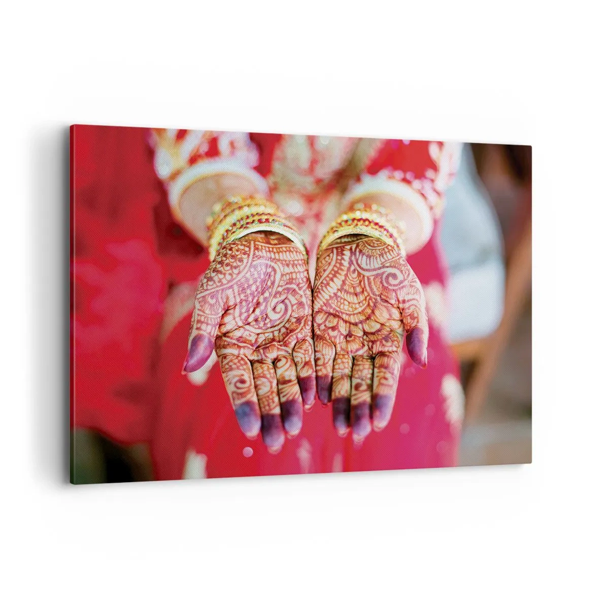 Lærredet er spændt op over rammen. Siderne og kanterne trykkes for at danne en fortsættelse af billedet. Maleriet er klar til at blive hængt op på væggen. Hvert produkt har en bøjle, der er fastgjort til rammen, og et samlesæt (skrue + dyvel).
