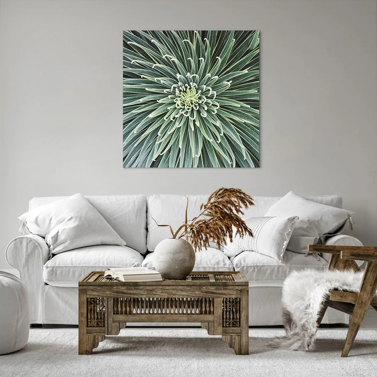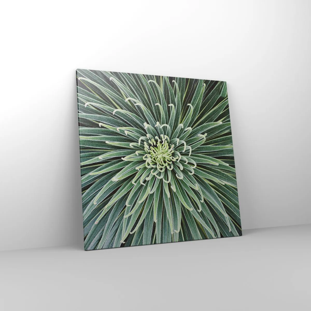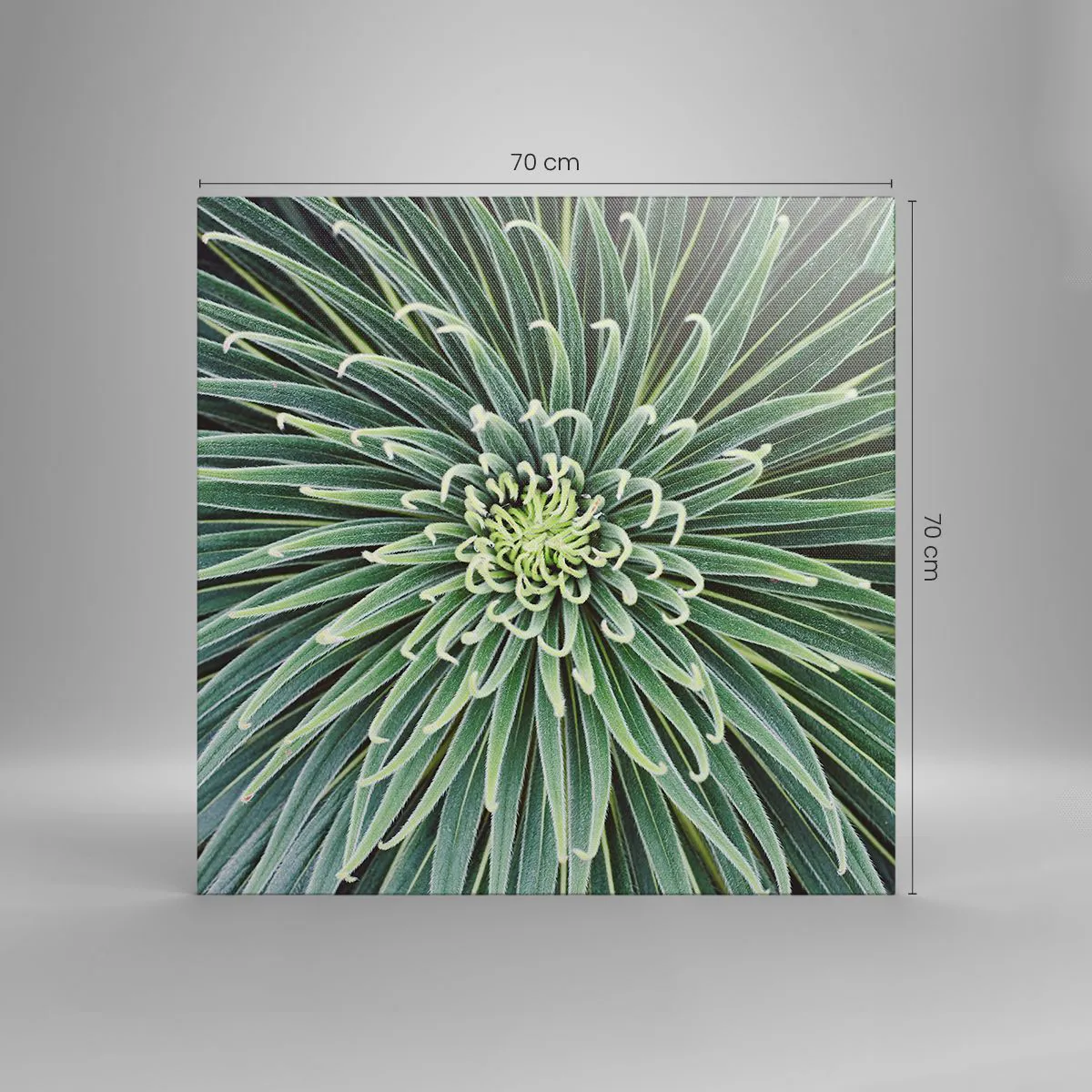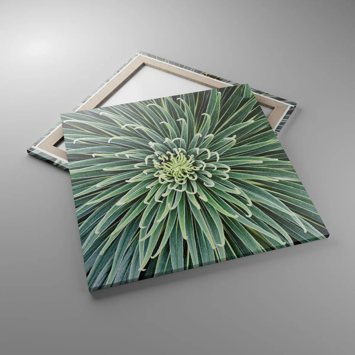 Lærredet er spændt op over rammen. Siderne og kanterne trykkes for at danne en fortsættelse af billedet. Maleriet er klar til at blive hængt op på væggen. Hvert produkt har en bøjle, der er fastgjort til rammen, og et samlesæt (skrue + dyvel).