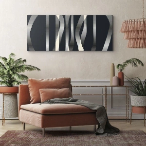 - Maleriet har geometriske linjer i lyse nuancer mod en mørk baggrund. Dets minimalistiske stil tilføjer klarhed og harmoni til interiøret.