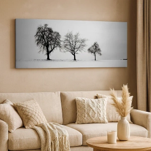 - Tre solitære træer står på en snedækket mark midt i et monokromatisk landskab. En minimalistisk komposition, der bringer fred og harmoni til ethvert interiør. Perfekt til en stue eller et soveværelse.