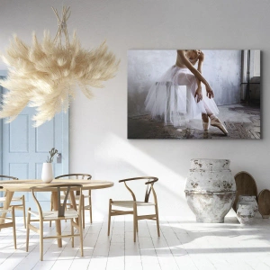 Lærredstryk - Billede på lærred - En ballerina i en delikat positur mod en industriel baggrund - 70x50cm - Før rampelysene skinner - Moderne vægdekoration til stue og soveværelse ARTTOR