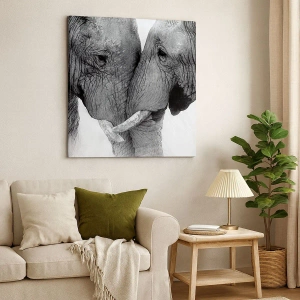 Lærredstryk - Billede på lærred - To elefanter i en øm gestus mod en monokrom baggrund - 70x50cm - Hjertelig tilståelse - Moderne vægdekoration til stue og soveværelse ARTTOR
