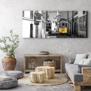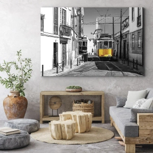 Lærredstryk - Billede på lærred - En gul sporvogn på Lissabons gader i en monokromatisk setting - 70x50cm - Lissabons ånd - Moderne vægdekoration til stue og soveværelse ARTTOR