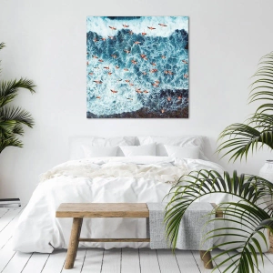 Lærredstryk - Billede på lærred - Et fugleperspektiv af lyserøde flamingoer over et blåt hav - 70x50cm - Parade ved havet - Moderne vægdekoration til stue og soveværelse ARTTOR