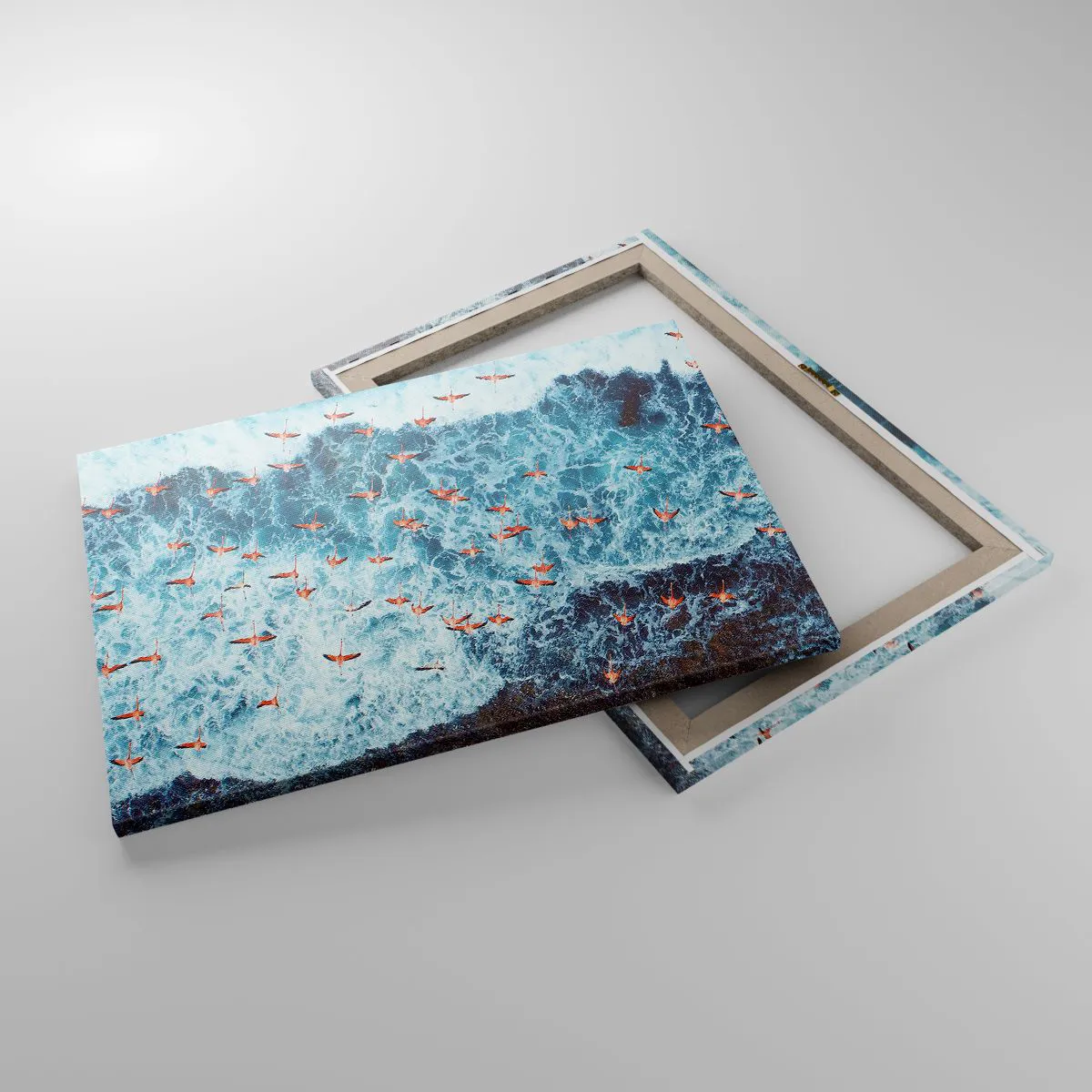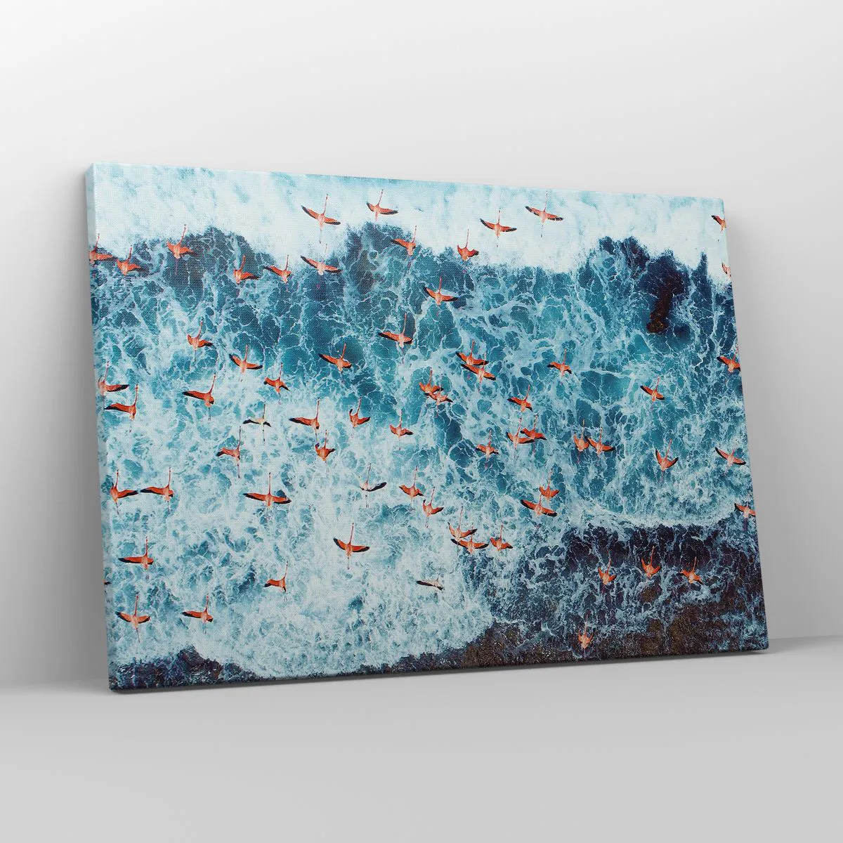 - Dette maleri forestiller en flok lyserøde flamingoer, der svæver over de blå havbølger. Det er den perfekte tilføjelse til moderne interiører og bringer naturens lethed og skønhed til sig.