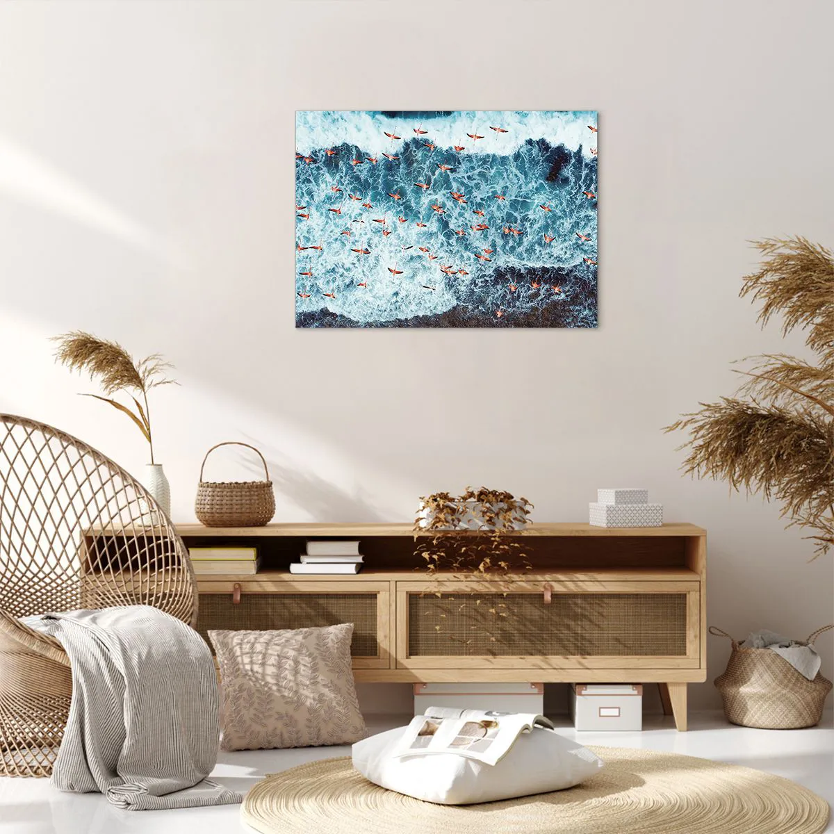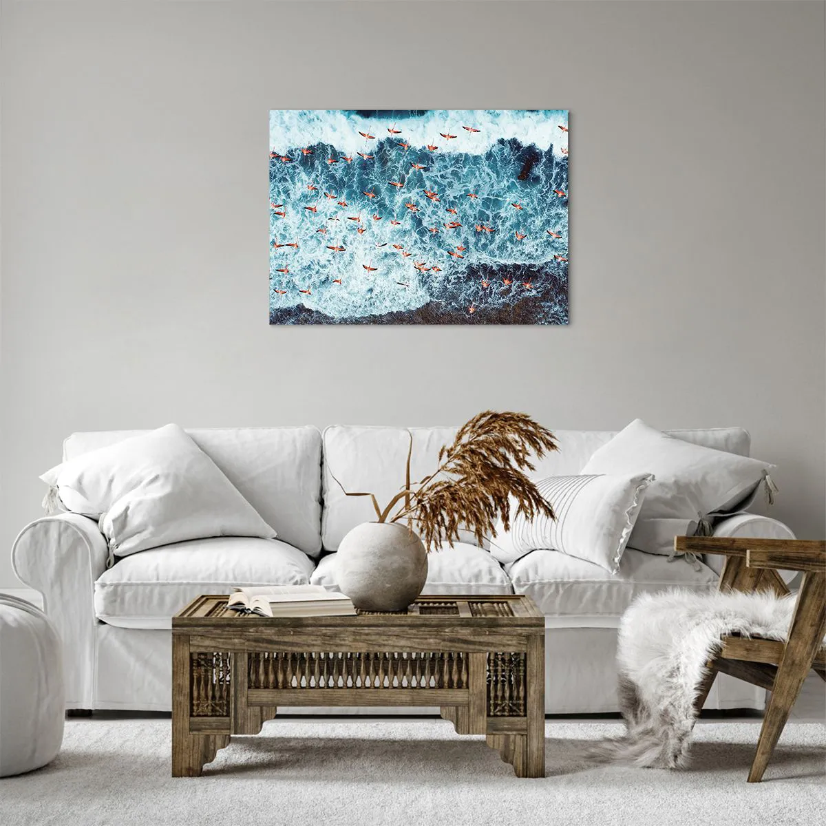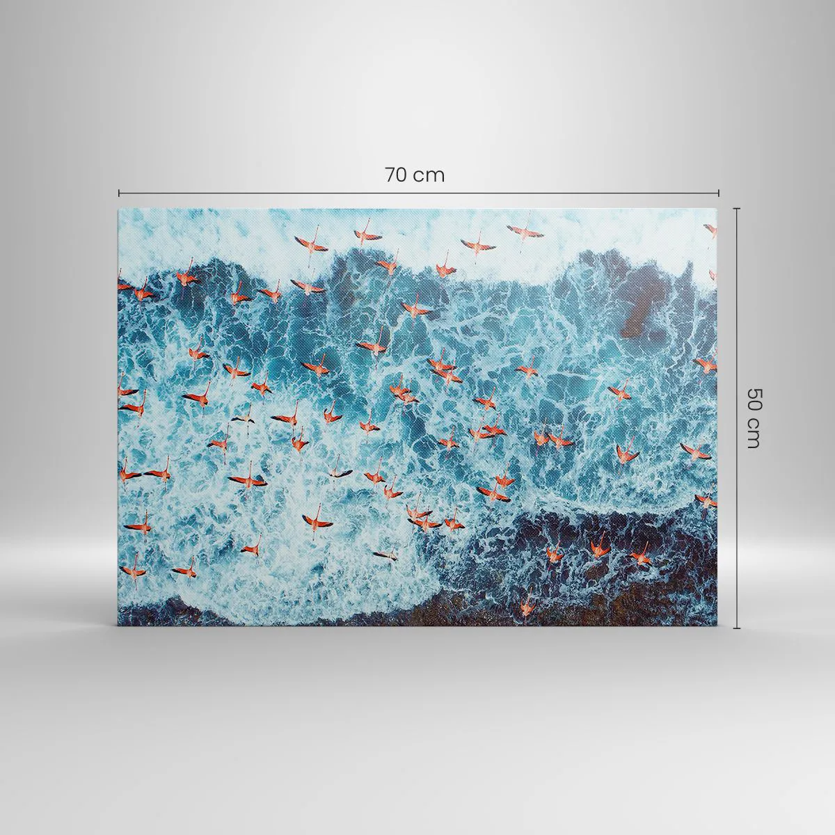 "Seaside Parade" er et ekstraordinært lærredstryk, der måler 70x50 cm, og som forestiller en flok lyserøde flamingoer, der svæver over de blå havbølger. Luftfotoet indfanger dynamikken i fuglenes bevægelser og bølgernes fredelige harmoni, hvilket skaber en inspirerende og eksotisk komposition.