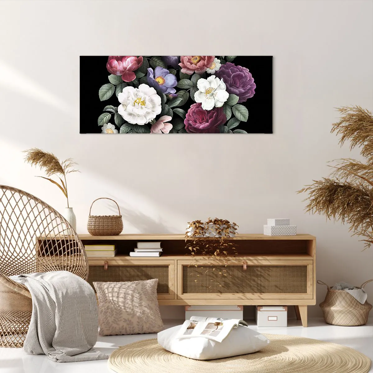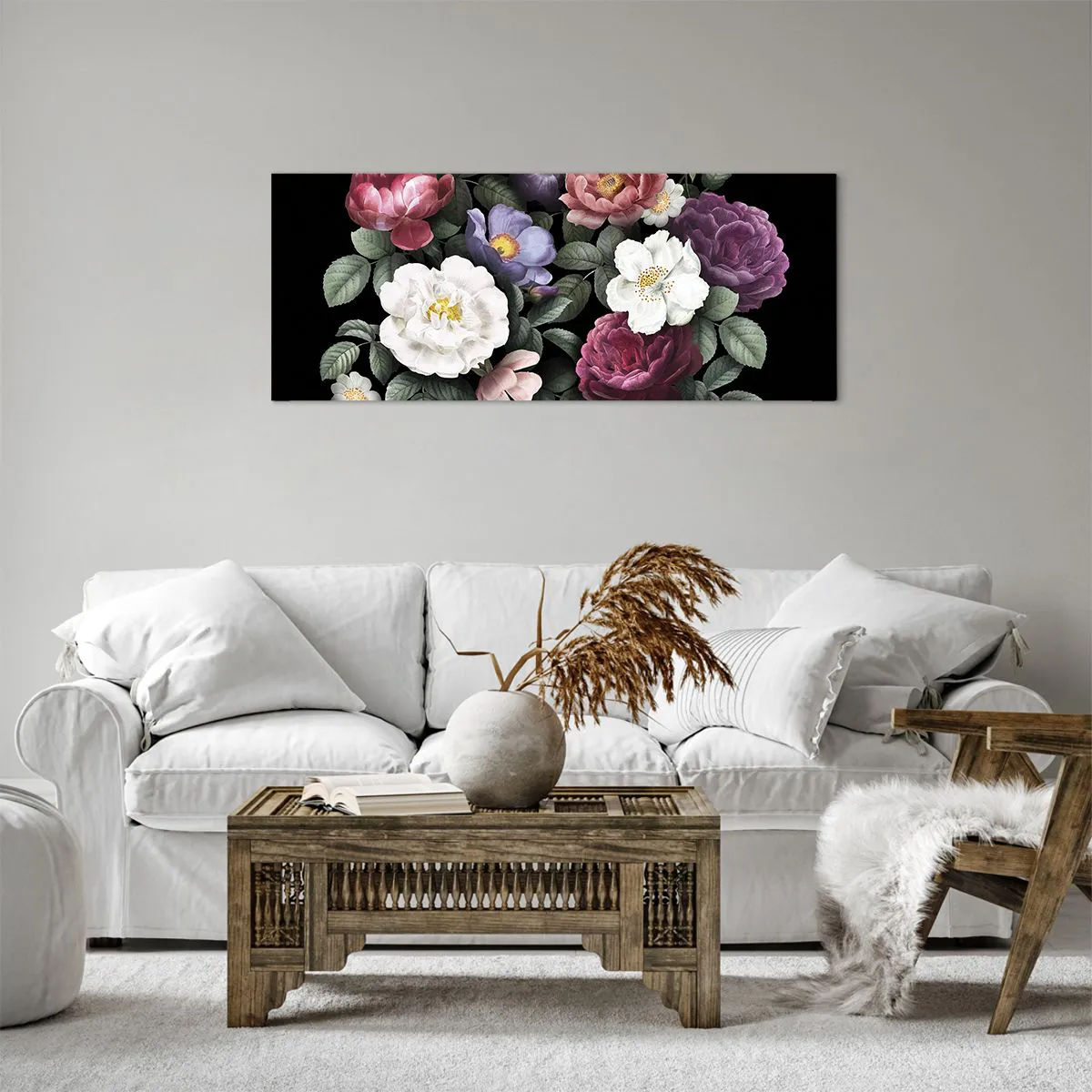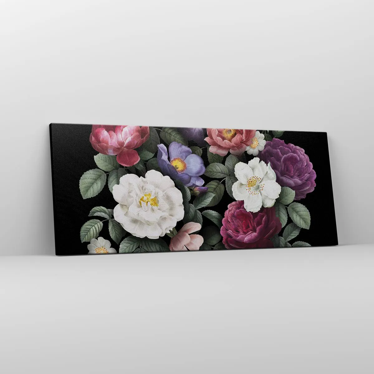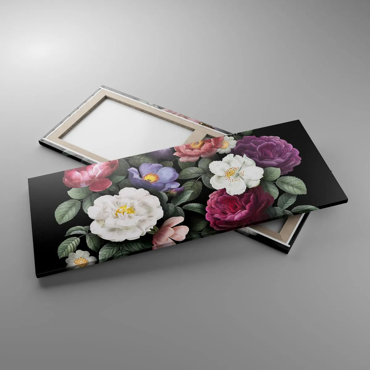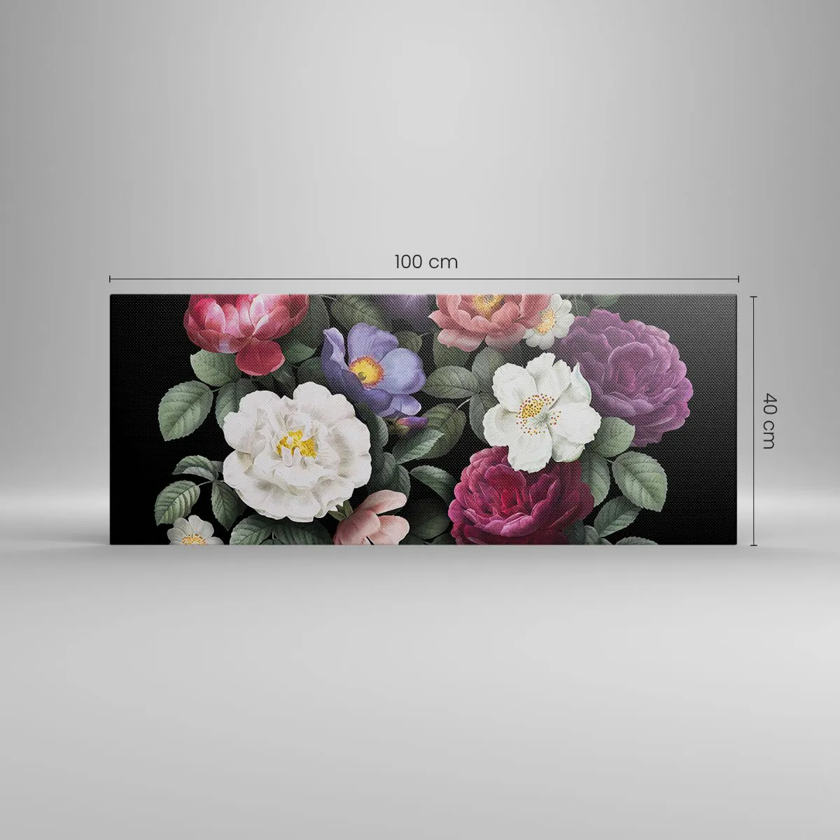 Lærredet er spændt op over rammen. Siderne og kanterne trykkes for at danne en fortsættelse af billedet. Maleriet er klar til at blive hængt op på væggen. Hvert produkt har en bøjle, der er fastgjort til rammen, og et samlesæt (skrue + dyvel).