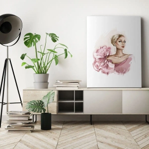 • Et elegant portræt af en kvinde i en lyserød kjole mod en lys baggrund. Den minimalistiske stil og de subtile detaljer bringer harmoni og sofistikering til interiøret. Et ideelt valg til moderne interiører.
