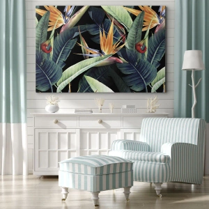 - Et eksotisk maleri, der forestiller tropiske blomster og blade mod en sort baggrund. Farverige accenter og et moderne design bringer energi og harmoni til interiøret. Et ideelt valg til moderne interiører.