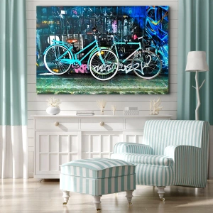 - Dette maleri i urban stil forestiller to turkise cykler mod en graffiti-baggrund. Perfekt til moderne interiører, da det skaber en kunstnerisk og dynamisk atmosfære. Mål: 70x50 cm.