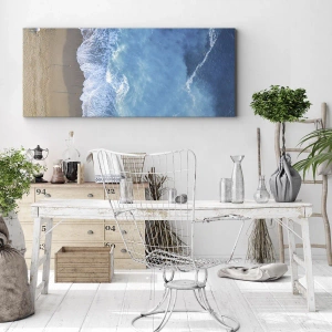 - Dette maleri forestiller et fugleperspektiv af en strand og havbølger. En vægdekoration, der bringer harmoni og en afslappende atmosfære til ethvert interiør.
