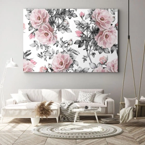 Vægkunst - Far vild i rosenblomster - Lyserøde roser og blade på en delikat sort-hvid baggrund
