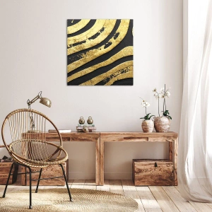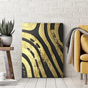 - Det abstrakte lærredstryk "Everything Flows" har gyldne bølger mod en sort baggrund, hvilket skaber en elegant og luksuriøs dekorativ effekt. Perfekt til moderne interiører som en stue, et kontor eller et soveværelse.
