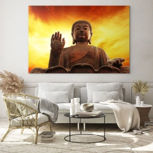 Vægkunst - Verdensfred - Buddha-statue mod baggrunden af en gylden solnedgang