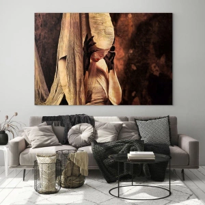Billede på glas - En mystisk kvinde omgivet af gyldne stoffer - 70x50cm - Mellem godt og ondt - Moderne vægdekoration til stue og soveværelse ARTTOR