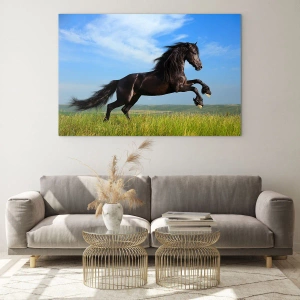 Billede på glas - En sort hest galoperer mod en blå himmel og en grøn eng. - 70x50cm - Et medrivende manifest for frihed - Moderne vægdekoration til stue og soveværelse ARTTOR