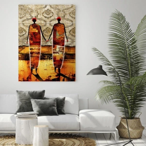 Etnisk komposition i afrikanske farver er et yderst kunstnerisk maleri på glas, der måler 70x50 cm, og som forestiller to abstrakte figurer, der holder hinanden i hånden mod en baggrund af rig ornamentik. Varme guld- og brune nuancer og detaljer skaber en harmonisk og inspirerende komposition.