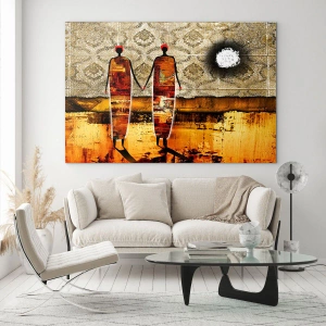 Billede på glas - To abstrakte figurer mod en baggrund af ornament og gyldne nuancer - 70x50cm - Etnisk sammensætning i farverne i Afrika - Moderne vægdekoration til stue og soveværelse ARTTOR