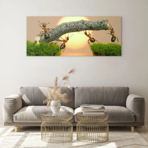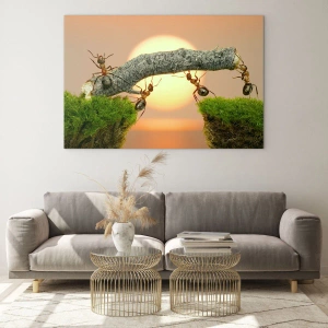 Billede på glas - Myrer bygger en bro ved solnedgang - 70x50cm - Glædeligt, fælles arbejde - Moderne vægdekoration til stue og soveværelse ARTTOR