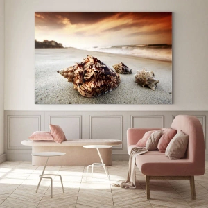- Maleriet forestiller muslingeskaller, der ligger på en sandstrand, omgivet af solnedgangens varme lys. Et perfekt motiv til at skabe en sommerlig atmosfære, afslapning og harmoni i ethvert interiør.