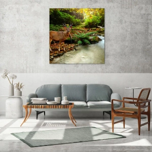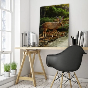 - Et malerisk maleri af en hjort ved en bæk i en solbeskinnet skov. Perfekt til naturelskere og dem, der elsker harmoniske interiører.