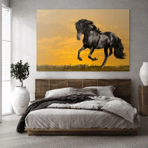 Maleriets motiv udstråler energi og inspiration og minder os om den vilde naturs skønhed og kraft. Den sorte hest symboliserer frihed og lidenskab, og kombinationen af de varme farver fra den nedgående sol med dyrets dynamiske kropsholdning skaber en utrolig atmosfærisk visuel effekt.